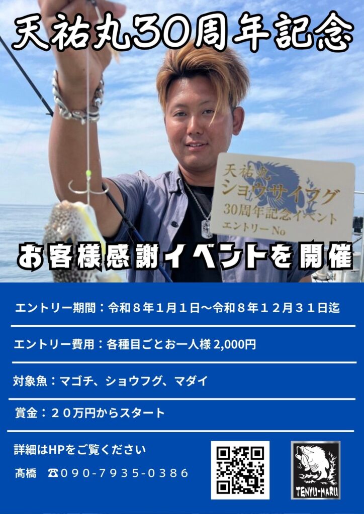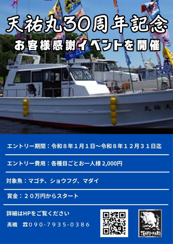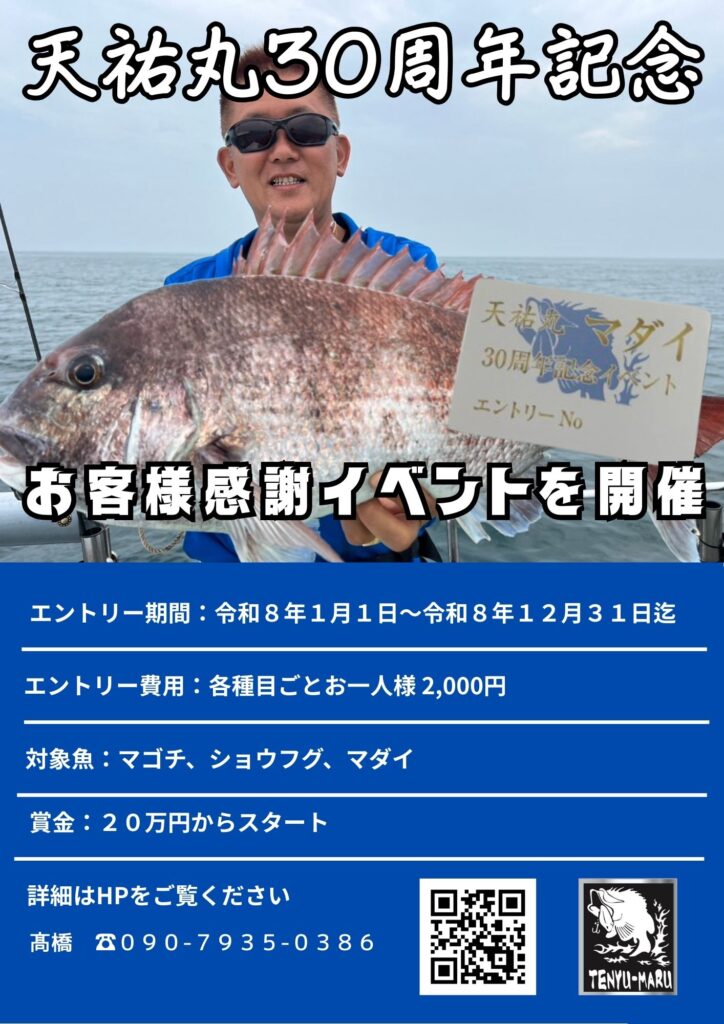 釣船の商品なのでちょっと良いロッドやリール、クーラーボックス等検討しましたが30周年記念!と考えるとちょっと良い釣具よりも笑顔で送り出してくれる家族や釣り仲間とちょっとした食事やプチ旅行していただければより多くの方に感謝が届くと思い賞金にさせて頂きました