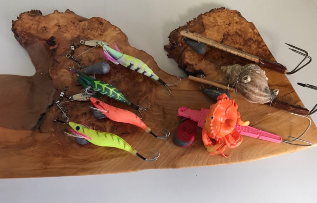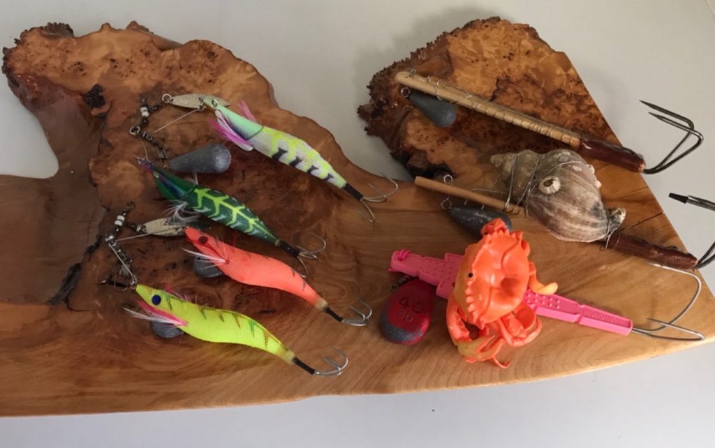 タコ用天秤にタコエギを1個か2個付けが主流です。タコテンヤにサンマやカニを巻いて使います。錘は30〜40号が良いですね。